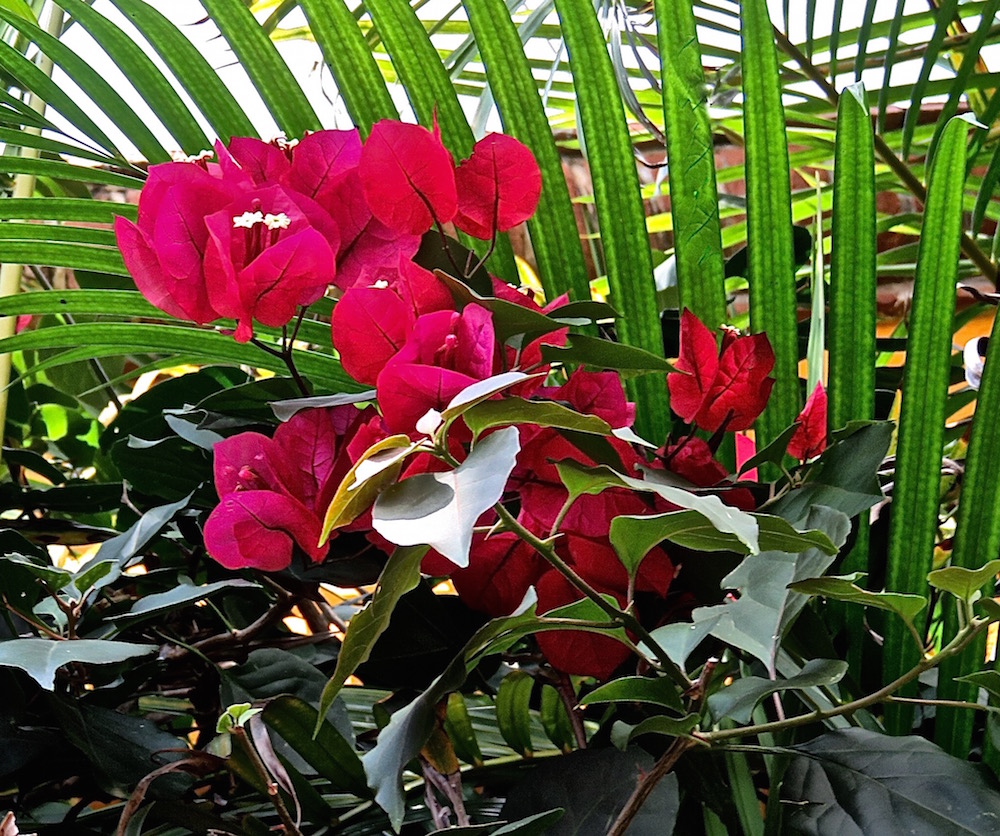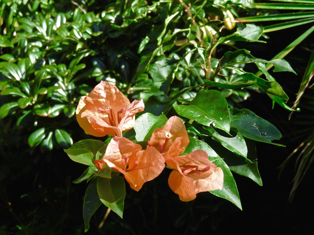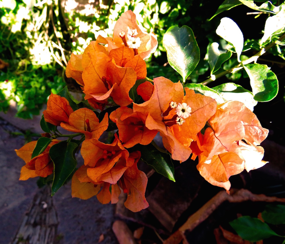 This is my very favorite color of bougainvillea. It changes in color within the same plant from pinkish to orange to gold. I believe it depends on the amount of sunlight it gets, but I haven’t really researched it so that is opinion only.