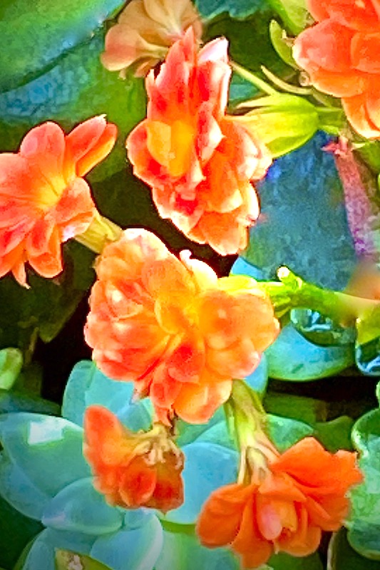 The photos of this kalanchoe plant last week depicted wilting flowers and buds. Here are those buds in their full bloom as well as more buds! The third photo is of leaves. As you can see, it has been raining off and on all day. By the time I went out to photograph the leaves, there had been a good deal of rain and it is still raining. About time. Our rainy season seems to be coming on 6 months late this year. I’m guessing that they are the “Beach Bells” variety.