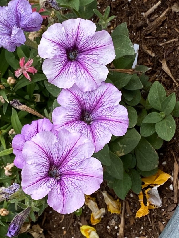 The popular name for this flower is “Seaside Petunia.” Ironic, because I photographed it in Sheridan, Wyoming. Looks like something has been chewing on the bottom flower. Rabbits, perhaps? There is always one in the yard there.