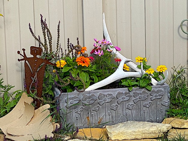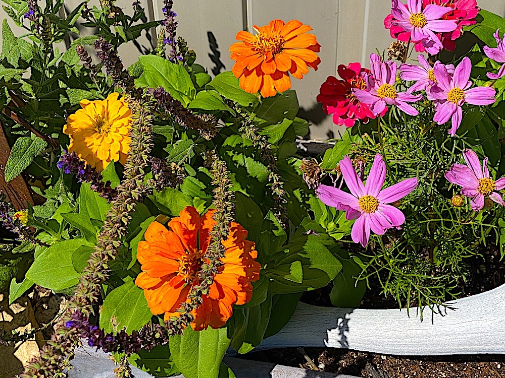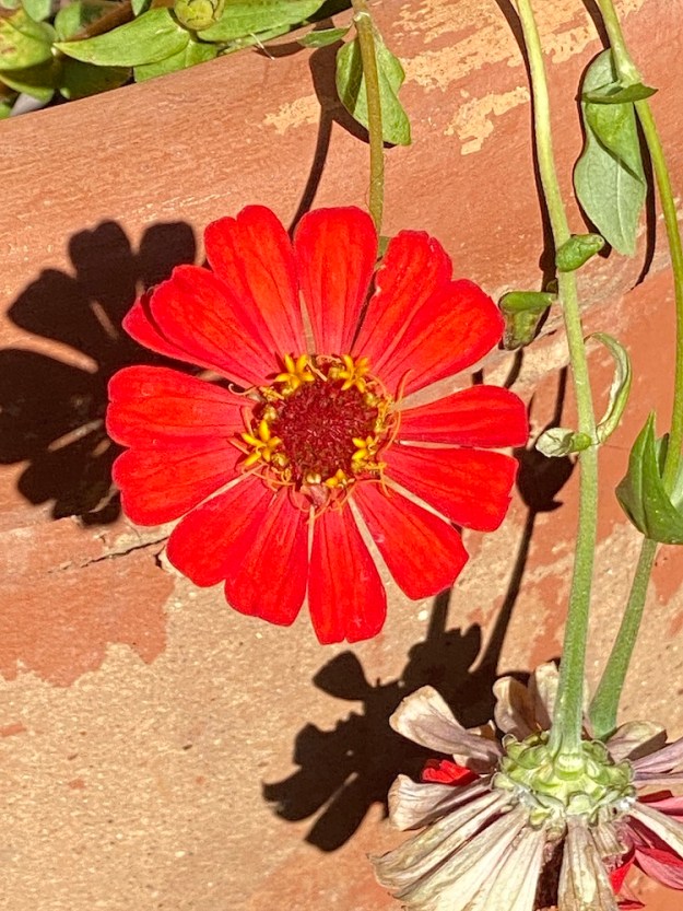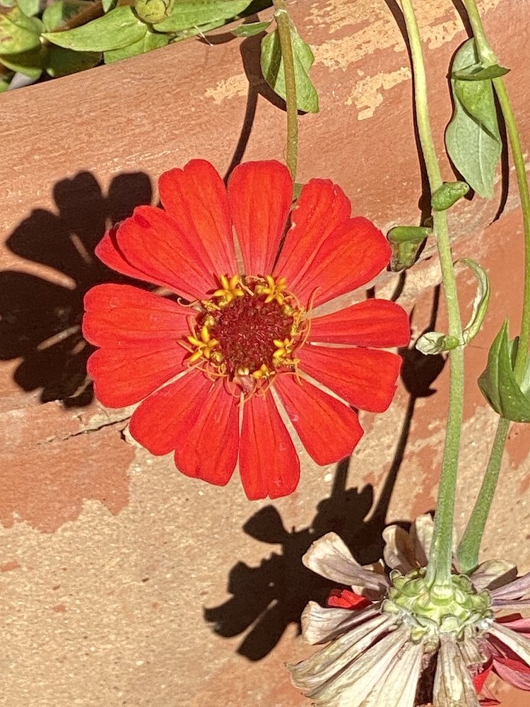These zinnias popped up on their own in my pot of potting soil I had on the porch to use to pot plants with..They’ve been hanging out for a month or so now–they and their kin!