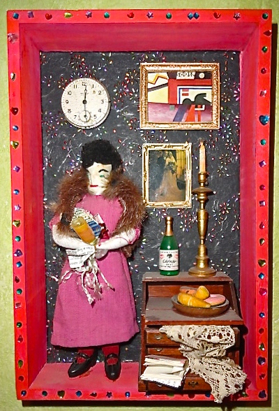 So, this is what I did, assembling a half dozen or so collages out the the most unlikely of materials–rubber mice, cut up thin metal jam and butter lids I’d collected on a European vacation, confetti, paper sculptures I’d cut out of pages of old poems. I know. Weird. I remember one of the titles was, “Party mouse wants to come out to play, but can’t.”