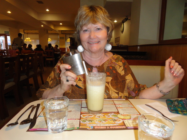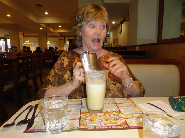 Remember The TV show “House Party,” where Art Linkletter inspected purses from the audience members and gave prizes for certain objects if they were found in their purses?  I still pack a purse as though I expect to be picked in House Party!  So, I just happened to have had in my purse a flask given to me recently by my friend Dianne which I had stocked with a fine Anejo rum! Blue and I both ordered a pineapple-coconut blended smoothie and I spiked them with rum from the flask.  I had always wanted a flask, and I was feeling happy on both counts and then, as usual, overacted as Blue snapped a second picture with my camera.
