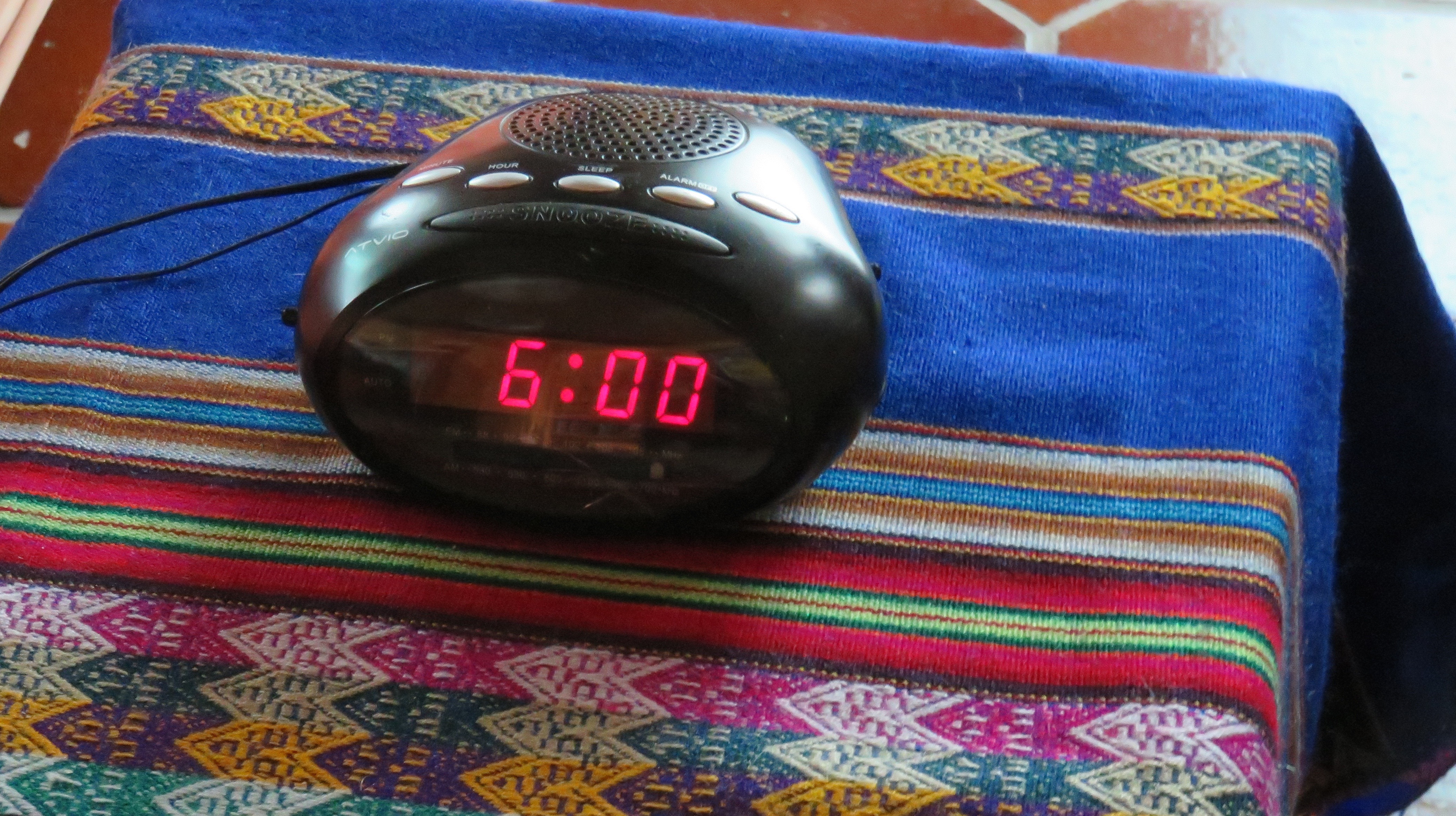 A vividly red 6 A.M. glares out from an electric alarm clock on the side table of the bed.