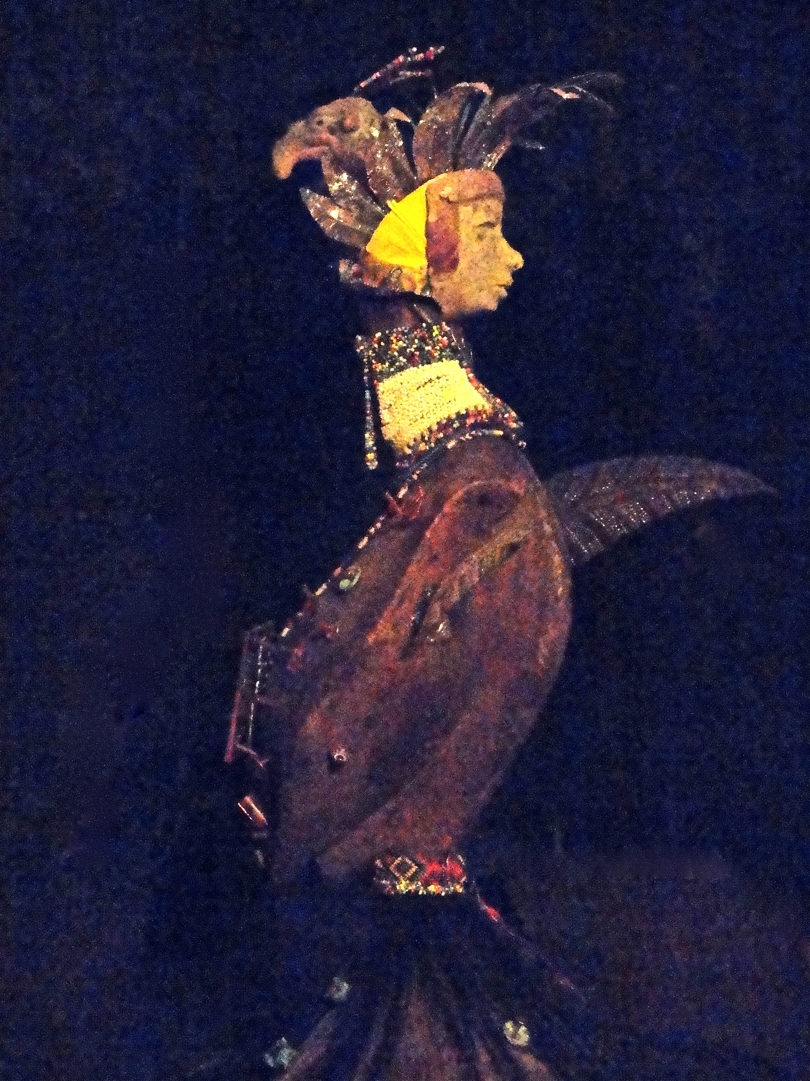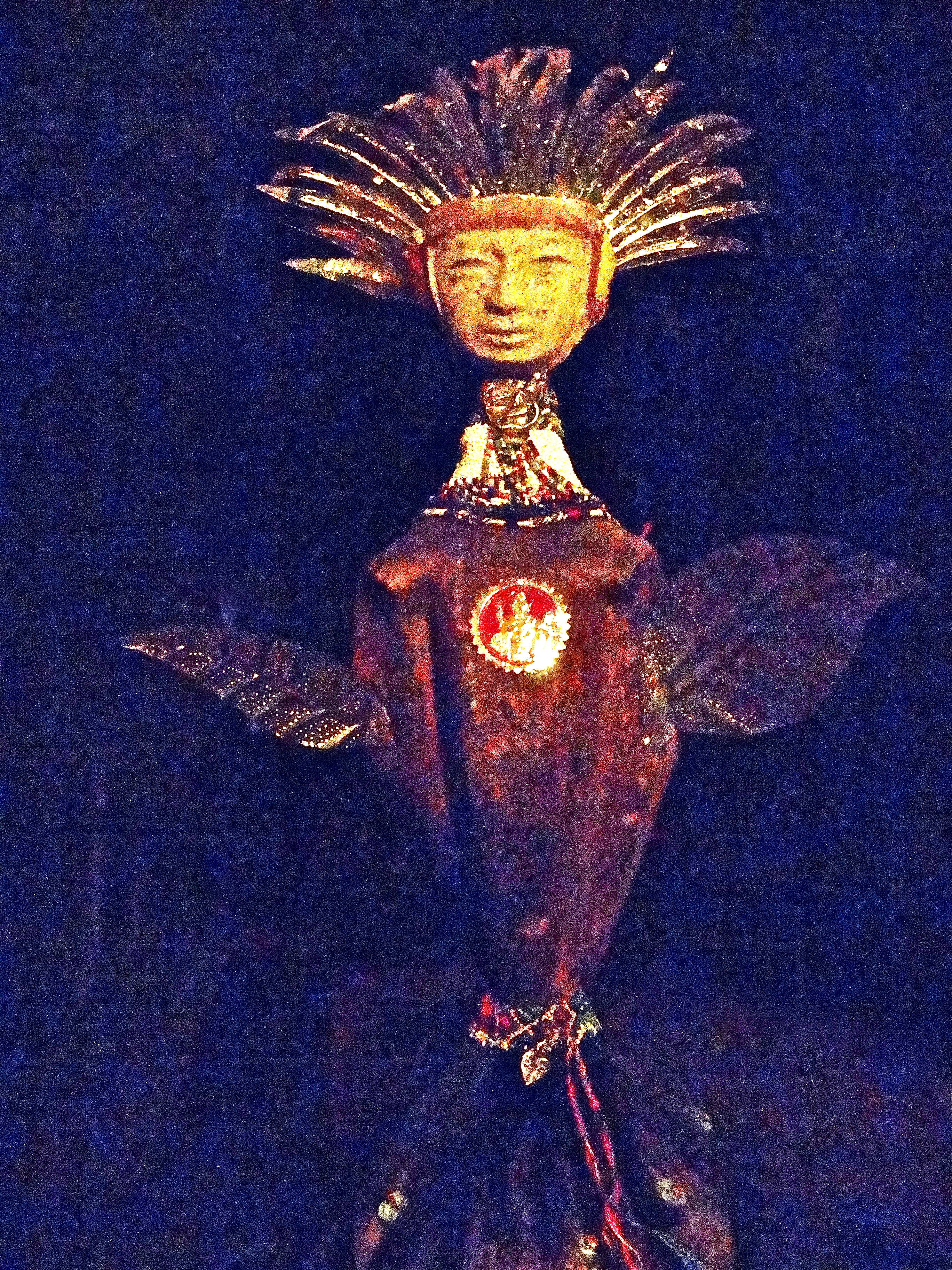 This detail examines the shattering of the male side of the ego by a feminine consciousness. The gold object in the glass case is a small replica of the instrument used to sever the head in sacrificial prehispanic temple ceremonies. The hammer shattering the glass is meant to symbolize the gentling effect of the feminine on the masculine.