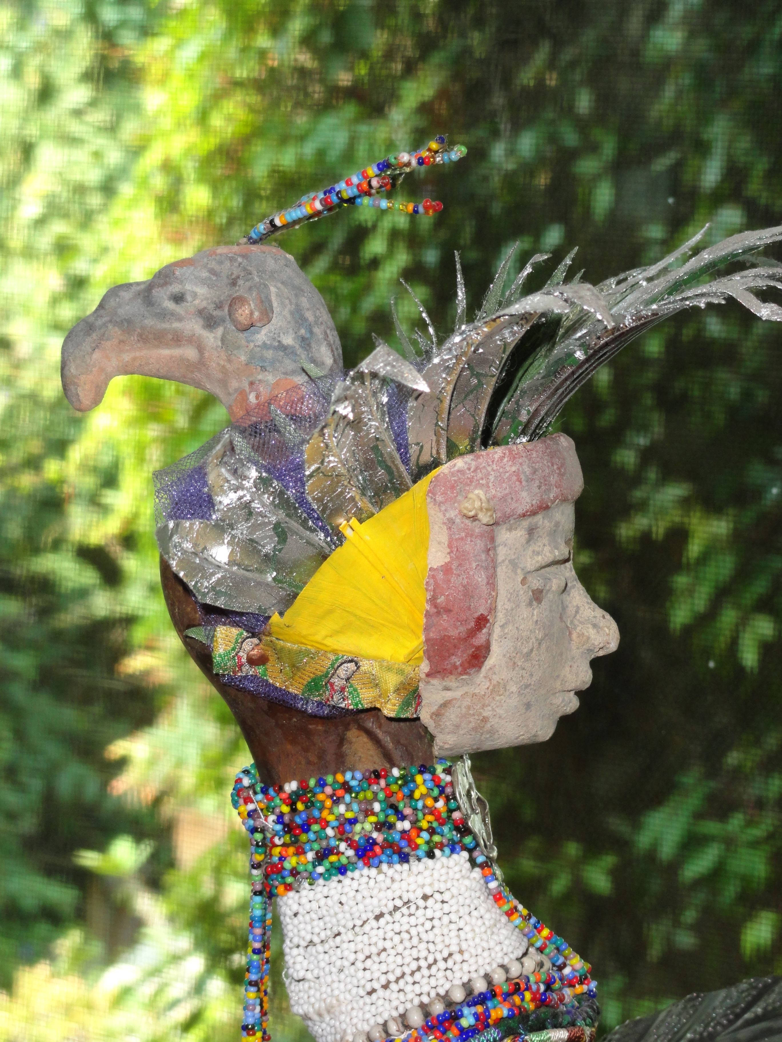 This detail symbolizes the shattering of the male side of the ego by a feminine consciousness.  The gold object in the glass case is a small replica of the instrument used to sever the head in sacrificial prehispanic temple ceremonies.  The hammer shattering the glass is meant to symbolize the gentling effect of the feminine on the msculine.