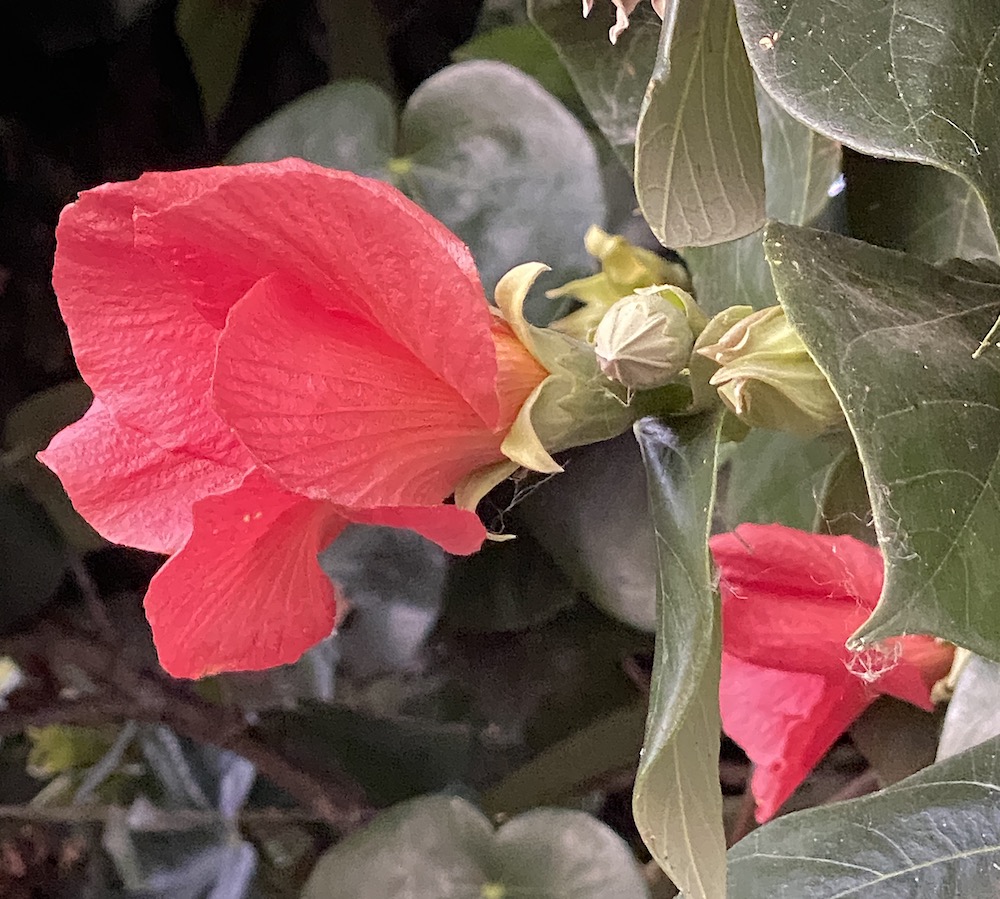 Some of the flowers on this tree were this vivid coral color. others were yellow with brown centers.