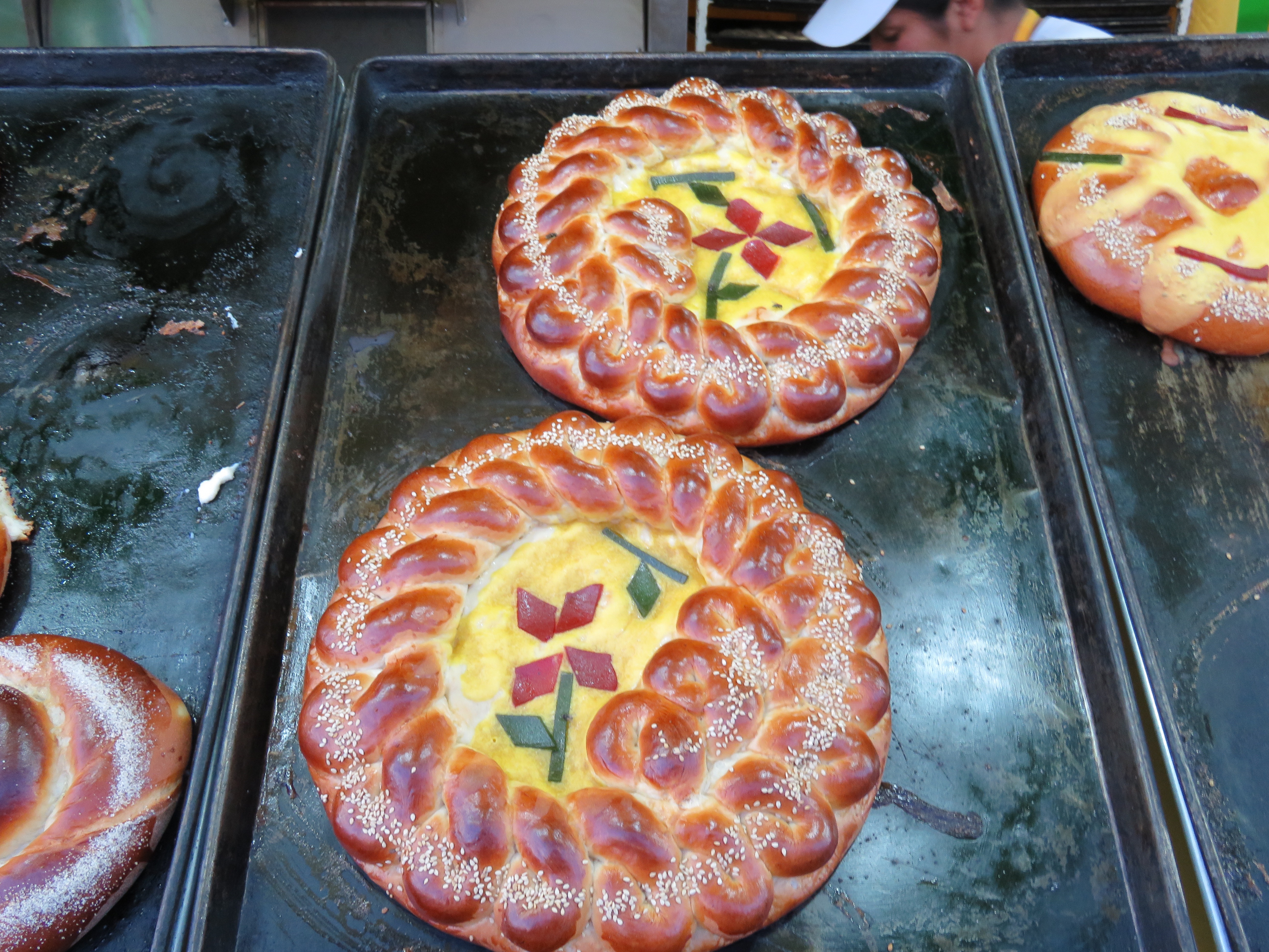 These memories are fueled by a festival of a different sort, and these pictures were in fact taken last night when my friend and I strolled through the streets of San Juan Cosala during their 11-day yearly religious fiesta in honor of Saint John the Baptist, the patron saint of the pueblo.  We ate pizza cooked in gas ovens on the spot, waffle cones filled with galleta ice cream and strawberry ices and churros–the Mexican extruded donuts–dipped delicious from their vat of hot oil and rolled in sugar.  We passed over the micheladas, tacos, tamales, the thick hot pancakes and the egg bread that was as much of an art form as a comestible.
