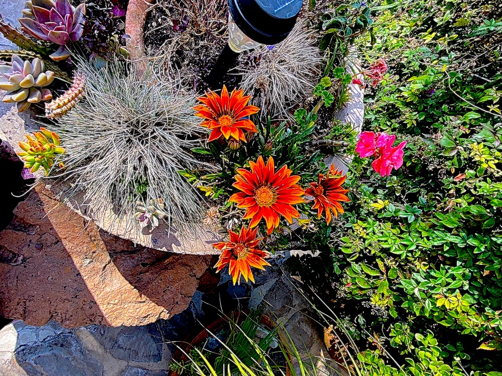 Gazania, Blue Fescue, Gardenias and assorted succulents. Close neighbors