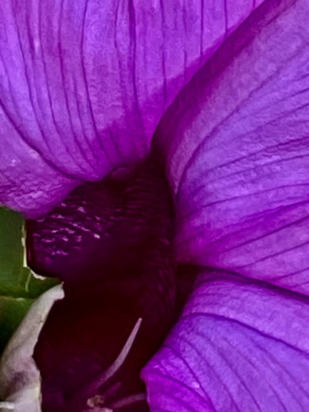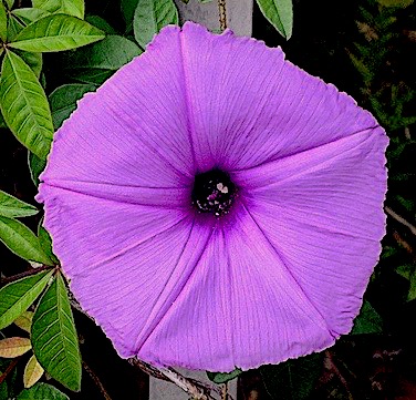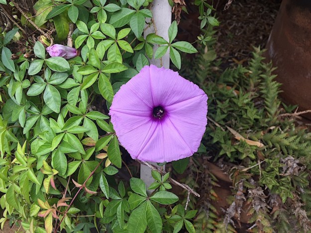 Now, some anonymous “Doubting Tom” has questioned the integrity of this posting and suggested I just stuck this morning glory into the shot. So, I’m adding a “proof shot” that shows the flower, sadly wilted a day later, attached to the vine. Doubt me not, oh anonymous one!!!