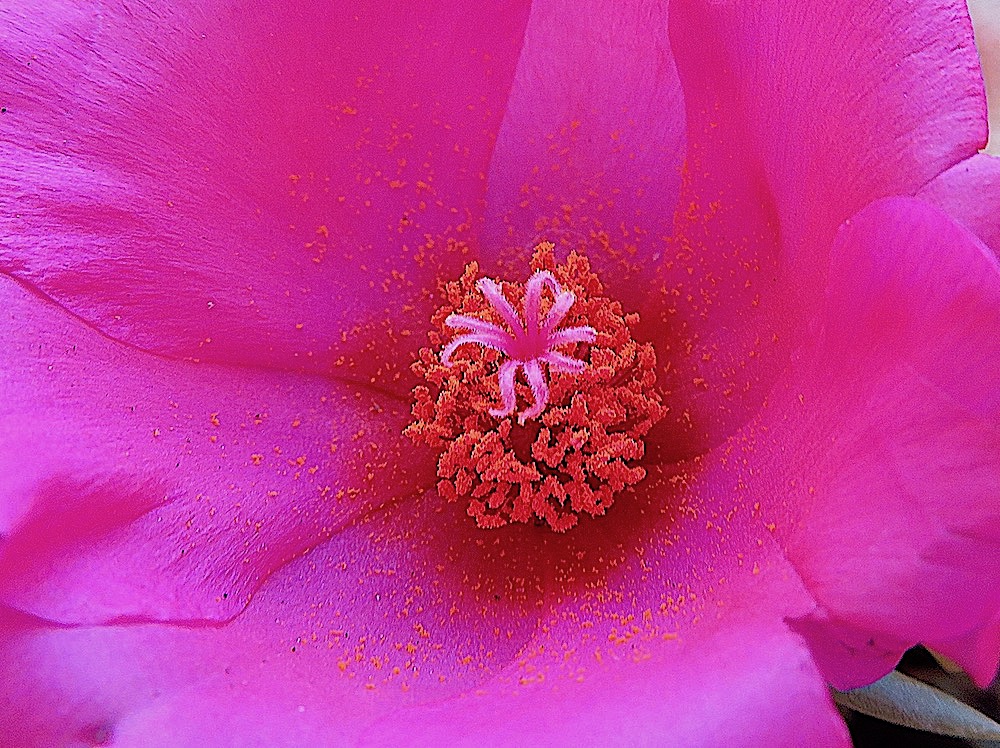 I planted this plant in the broken off lower part of a huge sculpture Bob and I bought the day we bought our house. There were two of the three-foot high precolumbian sculptures, one a seated woman and one a seated man. I put them on the pedestals inside the front gate–one on either side–one representing me and one Bob, who as you know, did not live long enough to actually move into our house. The “kittens” knocked one off its pedestal a year or more ago, the other a few months ago.  Since they were in too many pieces to possibly mend, I saved the one, intact from the waist down, and the other, only intact from the hips down, and planted ferns in them and put them back into their old positions.  Unfortunately, there wasn’t enough soil to support the one, so I replaced the fern with this moss rose, which seems to find its new home to be sufficient to thrive. Here is the newest member of its family.