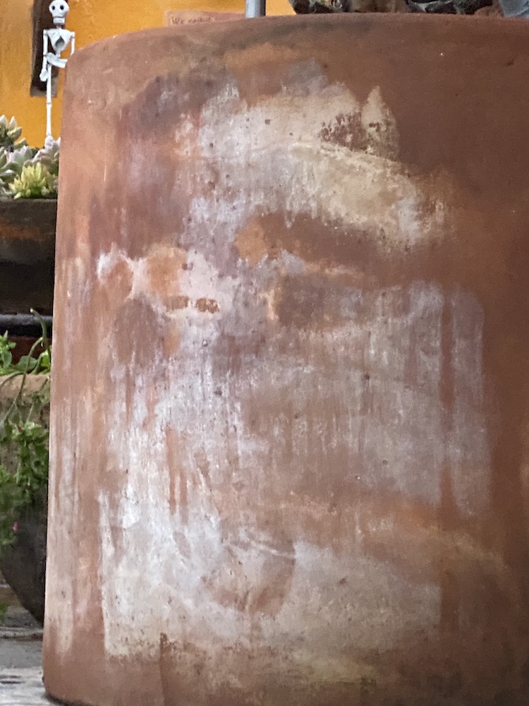 What has nature seen fit to draw on my large flower pot? You tell me what you see and then I’ll tell you what I saw.