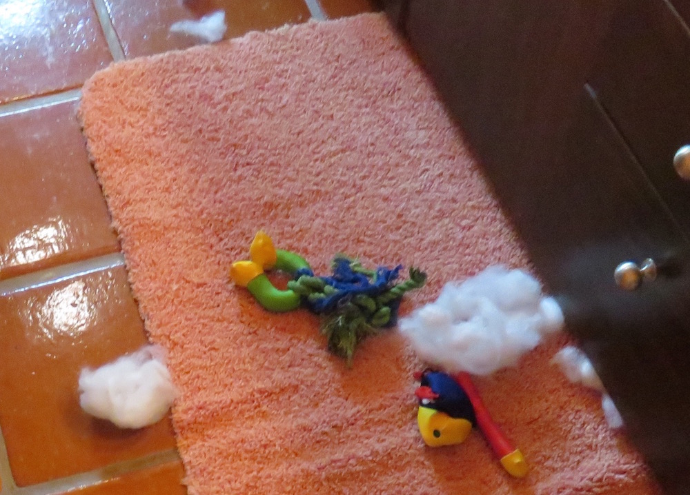 Needed: Innovative recycling ideas for 30 rolls of chewed up TP. Extra points for artistic uses. (If you are new to this story, better have a look HERE first.)