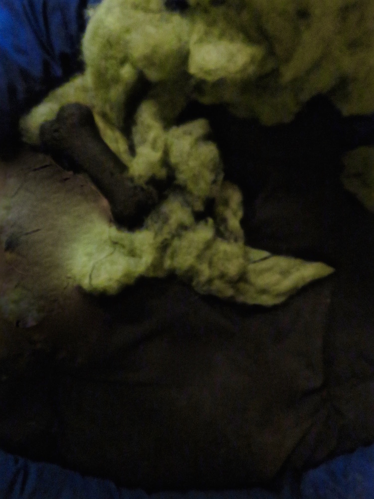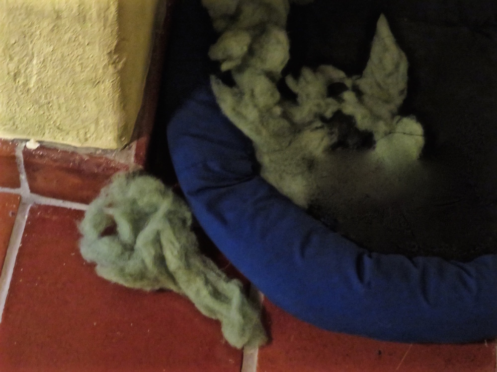So the green fluffy stuff is your bed–or at least part of it! Why would they stuff a dog bed with green stuffing? Now, I am remembering that Diego unstuffed two dog beds and a cat bed before he finally stopped biting and tearing apart everything in sight. Okay, Morrie. That’s one!