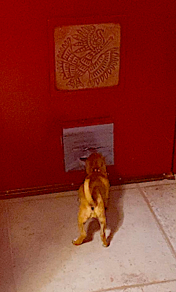 “You can’t let the dogs into the studio,” I directed, and shut the door. I leaned down to remove Morrie’s markers and by the time I arose, one plumber had gone to retrieve something from the garage, the door was open again and all three dogs were inside.