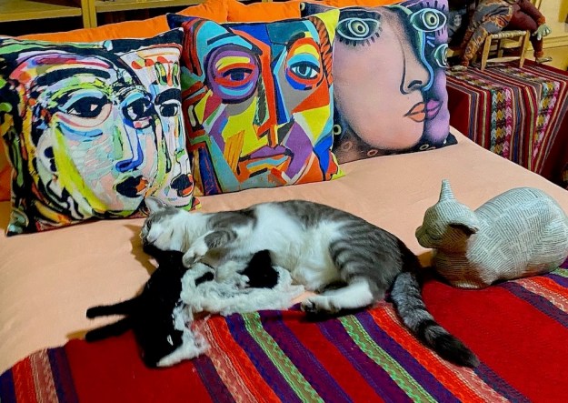 Ollie is the one in the middle–no longer runt of the litter–– and Roo is above him, Kukla in front. Fran is missing in this pic.