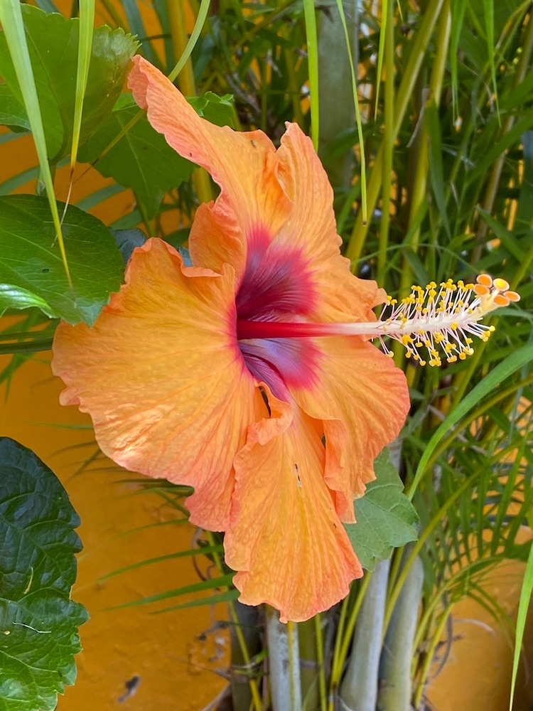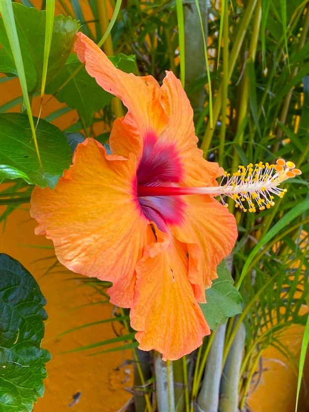 This orange hibiscus creates the fewest blooms of all the hibiscus in my garden. Makes me appreciate it all the more. Absence does make the heart grow fonder.