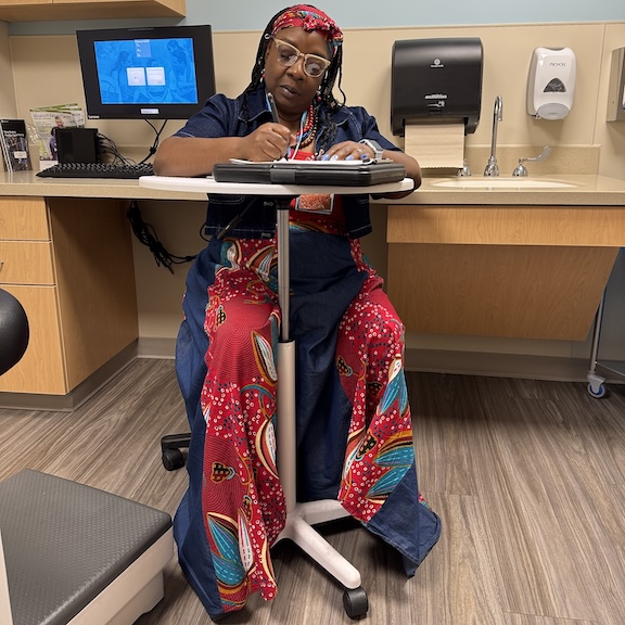Today I went for my second doctor’s appointment in Peoria and when my doctor and his nurse had left the room, they said for me to remain and a social worker came in to interview me to make sure I was not in duress, or being bothered by anyone…first time this had ever happened. But as she interviewed me, I became hypnotised by this pattern on the garment that covered her right knee. With my
