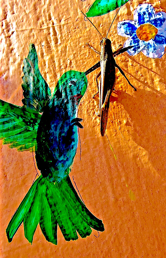 As I was taking the picture of the sconces outside, in the dark, I was breaking off the bougainvillea vines that grew in front of them, sticking myself on the thorns, as usual. Then I felt a sharp sting on my forearm and called out to Judy (a visiting writer who is doing a retablo workshop with me at my house) that I was stung by something. Then I felt a very sharp sting on my leg, under my Levis. I grabbed the place and squeezed the material of my Levis, running into the house, trying to get my shoes off and my jeans pulled down. “It’s stinging me, it’s stinging me!” I said.
