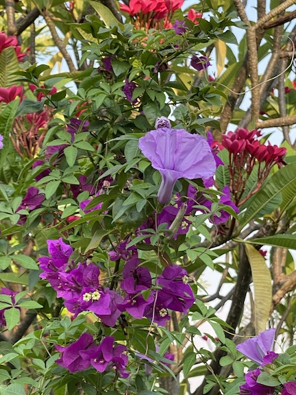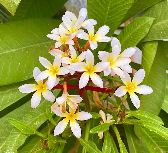The plumeria is at its height of flowering right now. Amazing how quickly it goes from being bare branches to covered with leaves and blooms.