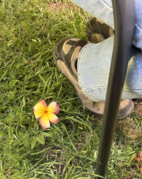 This is the last plumeria bloom of the season, folks. Somehow, rendered lovelier by its solo status.  Yesterday it was there. By Christmas, the tree will be totally devoid of leaves as well. So goes nature. I’ll see if Oscar will string it with garlands for me again this year.