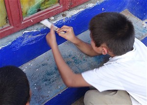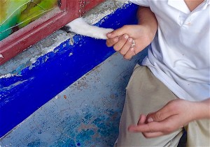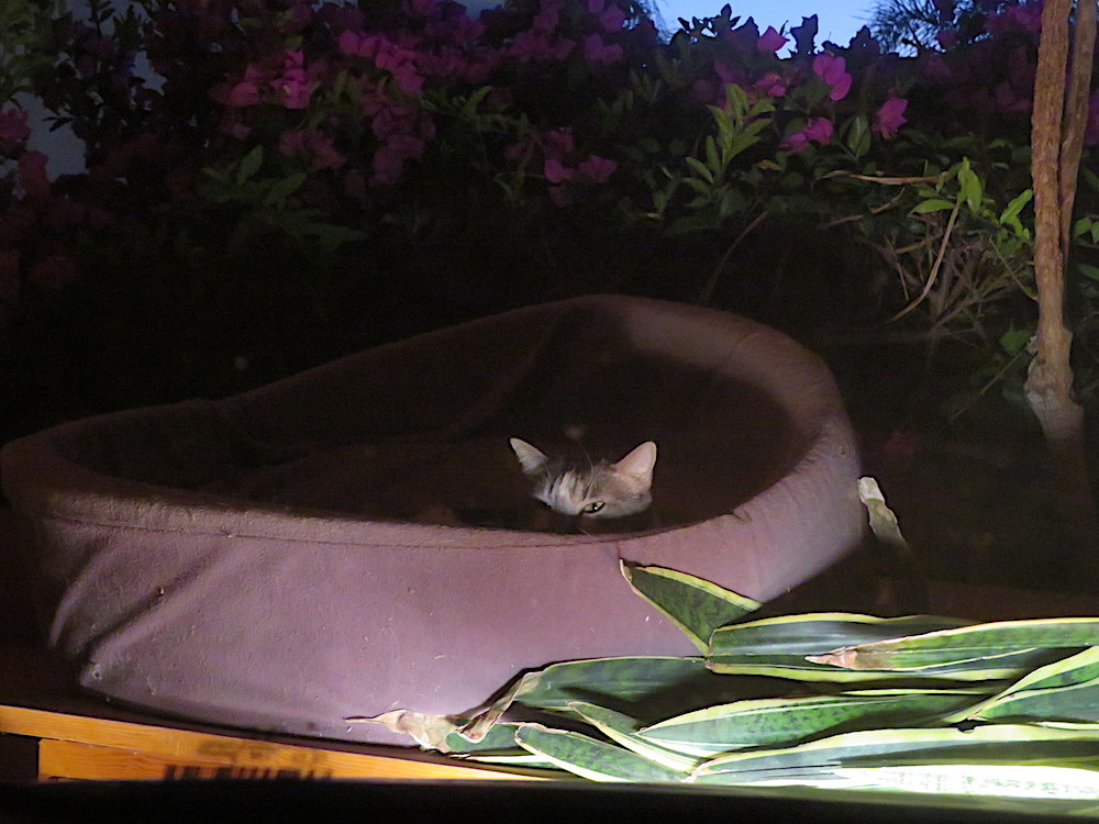 This is often the sight that greets me through my windshield when I drive into my garage. In this case, Pasiano had balanced the bed of the kitties up on the  top of the storage cupboards to make room for three big garbage bags full of mother-in-law tongue plants my neighbors had weeded out of their garden and contributed to me to put down in the lot and along my front wall. At other times, they owe their lofty perch to the fact that Yolanda has swept and swabbed the tile floor and put their bed up there so it won’t get wet.
