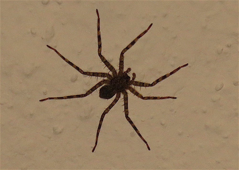 I woke up much earlier than usual today, and after I posted my poem and photos, I went back to bed. I closed my eyes for a short time, then opened them and stared fixedly at the ceiling above the bed.  It was not fully light in the room, but in the diffused light from the curtains which form a sort of scrim in the room, I could see a black blotch on the ceiling right above me.  Trying to figure out what it was, I scrunched my eyes up and eventually made out lines radiating out from the center.  It finally occurred to me that this might be a spider.  Further scrunching determined that it was, indeed, a delicate-looking spider perhaps an inch or two in diameter. It hasn’t moved in the half hour or so it has taken for me to write its laudatory poem, locate my camera, arrange for adequate lighting and camera settings, shoot its portrait and to get posted.  It will probably still be there tonight.  If so, its fame will probably be expanded with another poem.  If I remember.