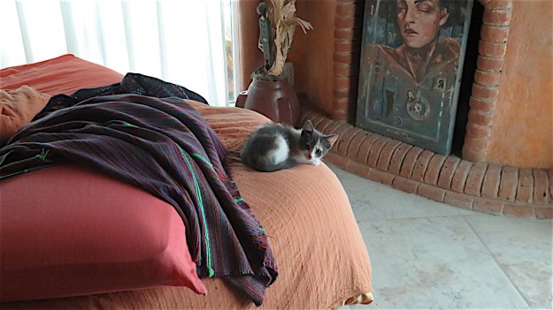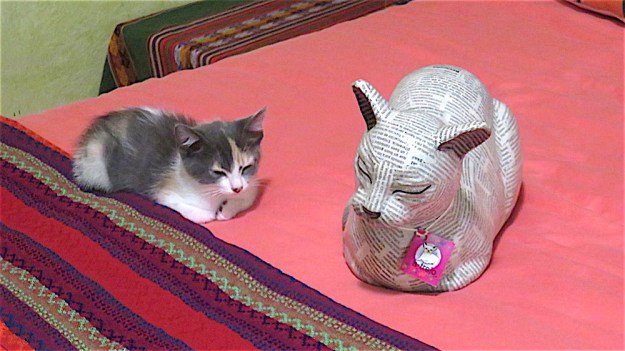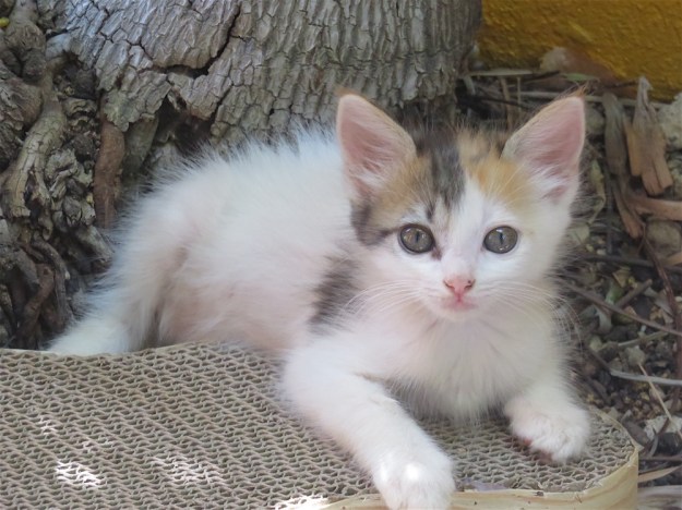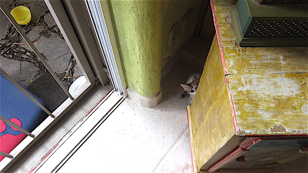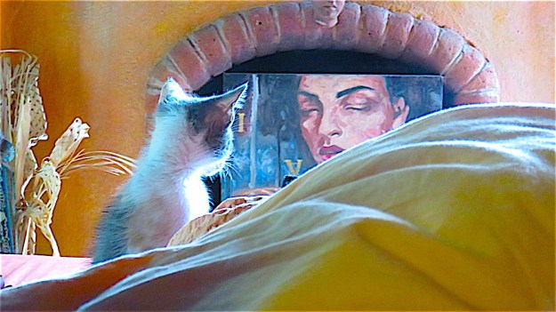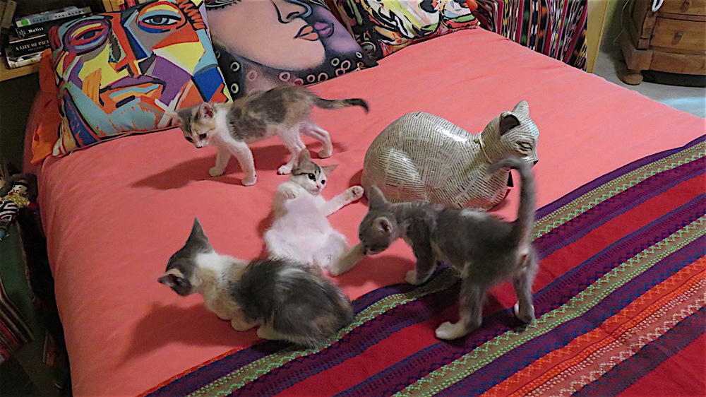 Kukla, Fran, Ollie and Roo are home after 24 hours at the neuter and spay spa—newly clipped and snipped and seemingly feeling no pain. After three months of life either in the house or in the small walled-off area outside the guest bedroom (and kitten suite) barred but with screen land glass sliders left open door, the vet says it is now okay to release them to their greater environment within my compound walls. They have a new outside sleeping room, but as you can see, are still curious about their old digs as well. Frannie has decided to stay inside with me for now. That’s her tail you see curling around over my screen. They were at first suspicious of their food bowls placed outside, refused to eat, then gave in to hunger and ate, but refused their next meal which was being devoured by ants, so I moved it inside. I let them roam inside and out, then locked them out, now have let them in to sleep and left screen open but closed the door to front garden so their outside area is, as before, secure. Except for bats. Cross your fingers. Below the poem are probably too many photos depicting their first afternoon of freedom, including a bit of dialogue with the dogs.
