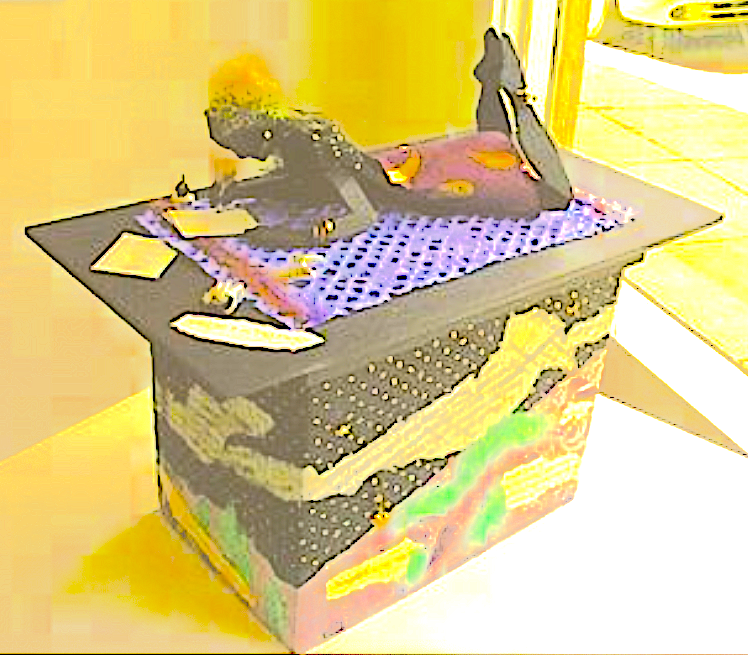 This post came about because of a Facebook message from Linda Levy, a friend of many years who lives in Bonny Doon, California. When she saw news of my upcoming show entitled “The Poet’s Eye, the Artist’s Tongue,” she sent a photo of a piece we collaborated on when I was the curator of the Santa Cruz Mountains Art Center in Ben Lomond, CA. I used that title for a show that involved artists and poets collaborating on pieces. Either the artist showed the poet a work of art they had created and the poet wrote a poem to go along with it or the poet presented a poem for the artist to make a piece to go with. In this case, I gave her the poem and the illustration above is the cardboard and paper sculpture she made. The ripped-out pieces of poetry on the desk are the words of the poem above.