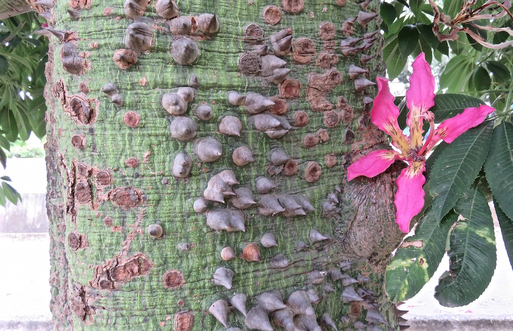 I later published pictures of its thorny trunk. These photos of the trunk are new, as are all of these photos, except for the ones that show flowers, since the tree is no longer blooming. (An explanation of supposed reasons for the thorns is given below in the comments section.)