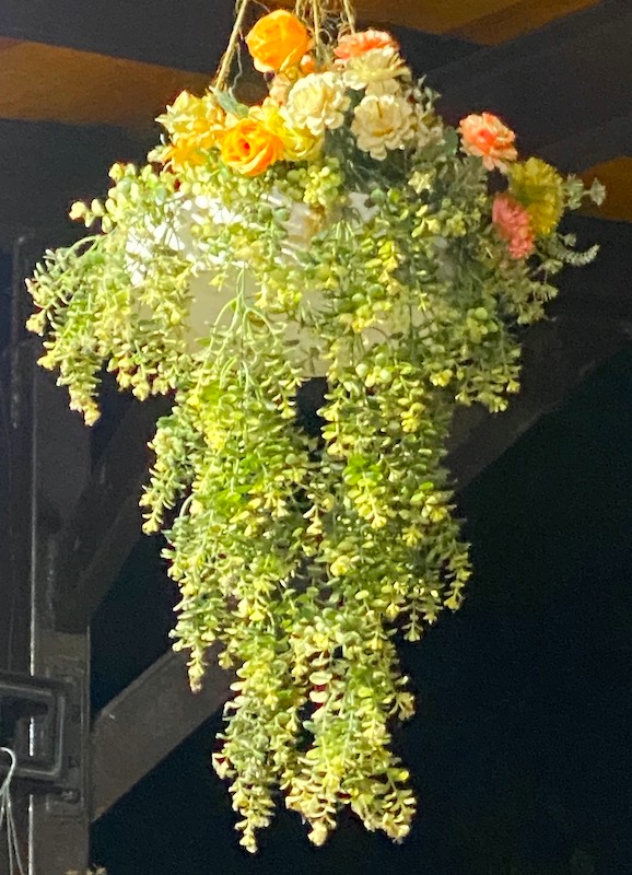 This sculpture is made from stone slabs a sculptor friend purchased to carve. You can see the holes drilled to split the stone, but I loved the individual pieces assembled as they are. They now form this “bench” that holds a planter near my hot tub and pool. It contains succulents, lobelia, gardenias and I believe gazanias that perhaps have been crowded out since planting a few years ago. The bougainvillea is a visitor from the huge bush behind it. There’s some Virginia Creeper reaching its fingers into the pot as well as a lopsided solar light.