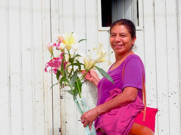My friend Leslie gave me a huge gorgeous bouquet when she left to go back to the States. When Yolanda came to work the next day, she was admiring it. I asked what her favorite flowers were and she said the lilies, so I split the bouquet in two. Here she is with her half. I’ll show you mine tomorrow.