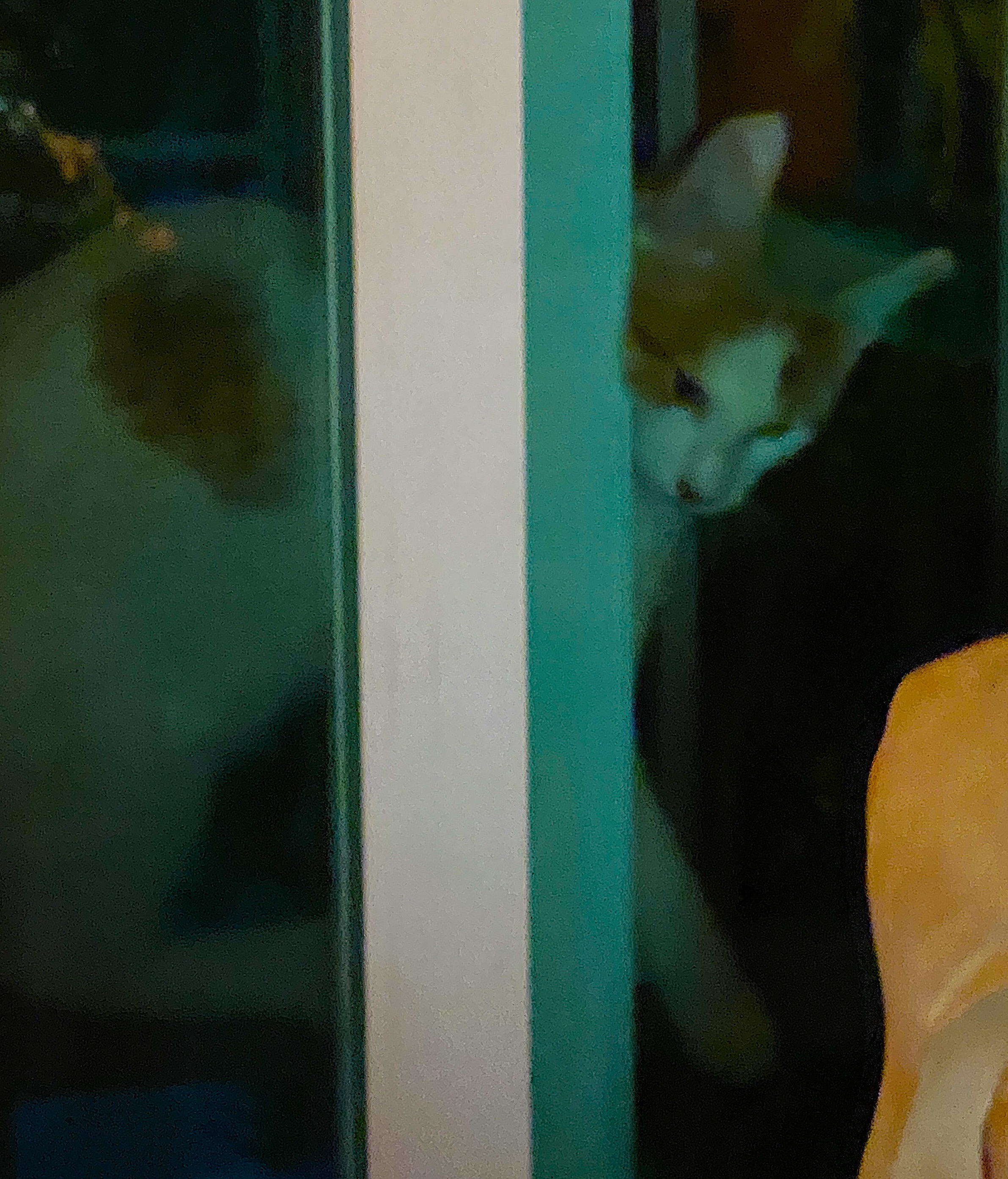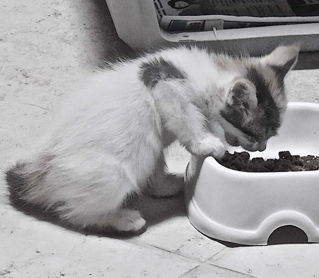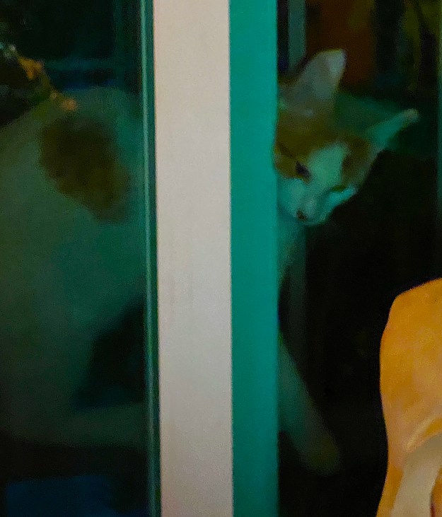 If you haven’t read yesterday”s blog about my intruder cat, go HERE to read the story before you go on reading this post. This is the happy ending. This morning she was still here, glued to the glass door of the kitchen so I had to nudge her away with the door to get it open to feed the cats. The other two cats rushed inside to get away from her and luckily their dishes from last night’s feeding were still inside. I kept inturder cat at bay while I got a scoop of dry and a packet of wet catfood and filled the dishes, but my cats wouldn’t come to eat even though the door was closed, because they could see the intruder through the glass. So, I had to move their dishes into the living room out of sight of i.c. who continued to yeowl at the door.